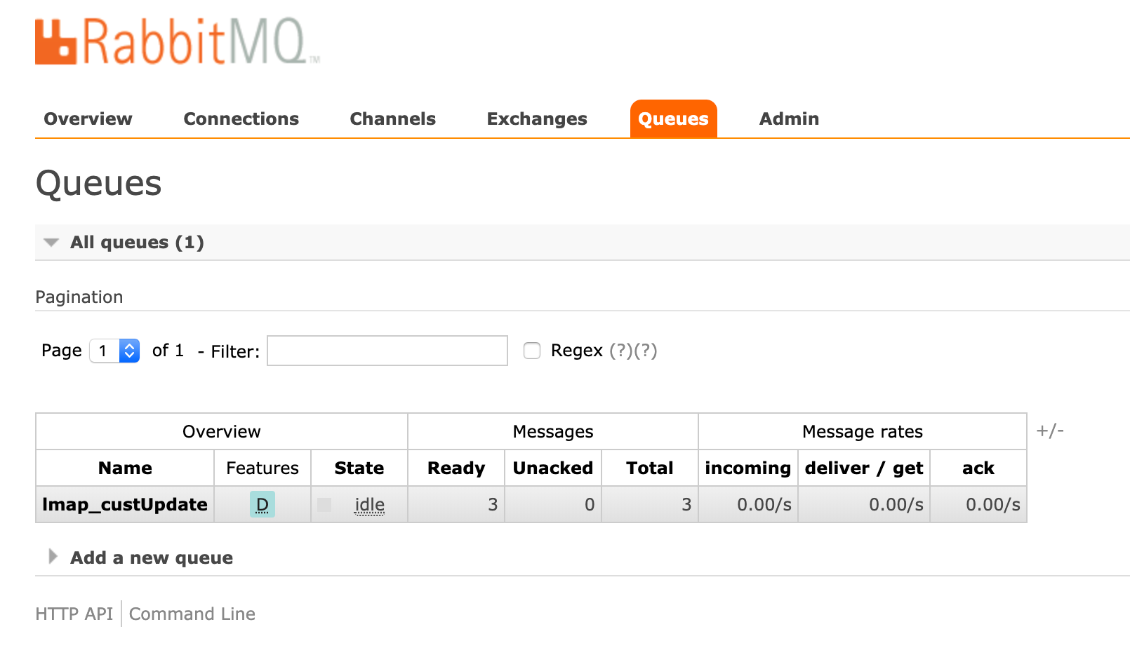 Here we see the lmap_custUpdate queue - note that it is durable, if this isn't set then it doesn't survive a server restart. Also note that this one has three messages in the queue (awaiting a consumer to start up). *